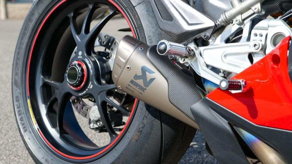 The engine is a 1,103cc liquid-cooled V4 producing up to 215 hp/124 Nm. The gearbox is a 6-speed quickshifter with a slipper clutch. Front and rear suspension is Öhlins NPX25/30 (front) and TTX36 (rear) fully-adjustable, respectively. Brembo Stylema dual discs and Cornering ABS EVO take care of braking. A 5-inch TFT console displays ride modes, telemetry, and connectivity.